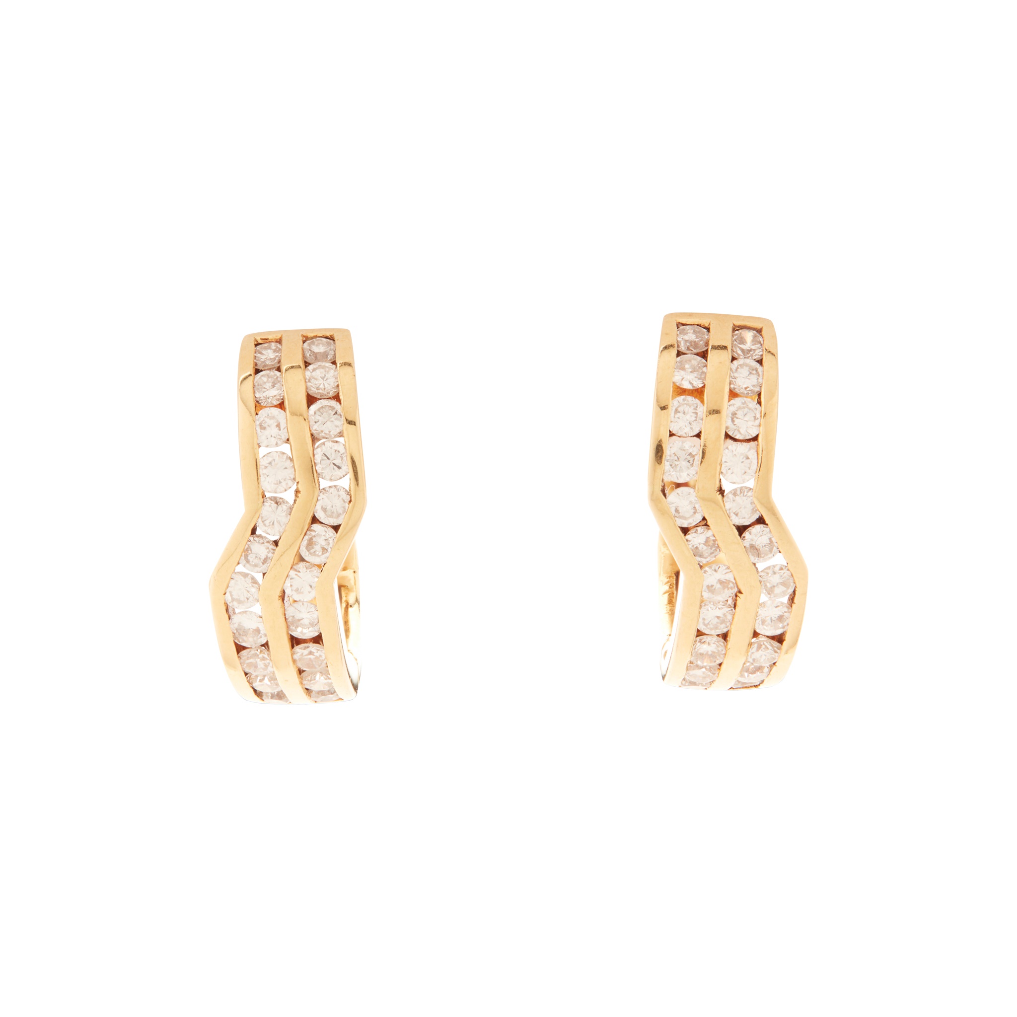 each of hinged hoop design, the front channel-set with two rows of round brilliant-cut diamonds, post and hinged clip fittings, stamped 750