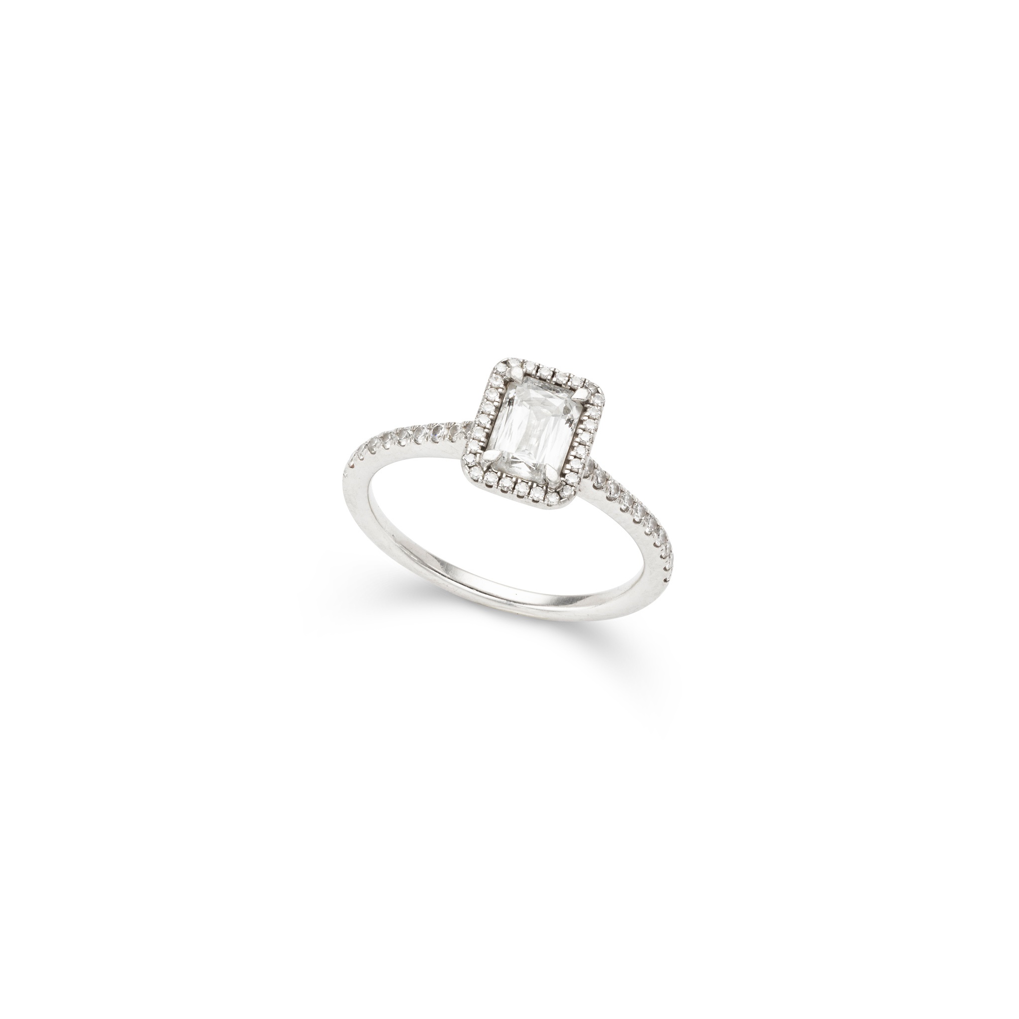claw-set with a cut-cornered rectangular modified brilliant-cut diamond, to a brilliant-cut diamond surround and shoulders, modelled in platinum; with accompanying Gemological Institute of America report, numbered 5266393412, dated 02.11.2017, stating that the principal diamond weighing 1.05cts, is E colour and VS1 clarity, showing no fluorescence