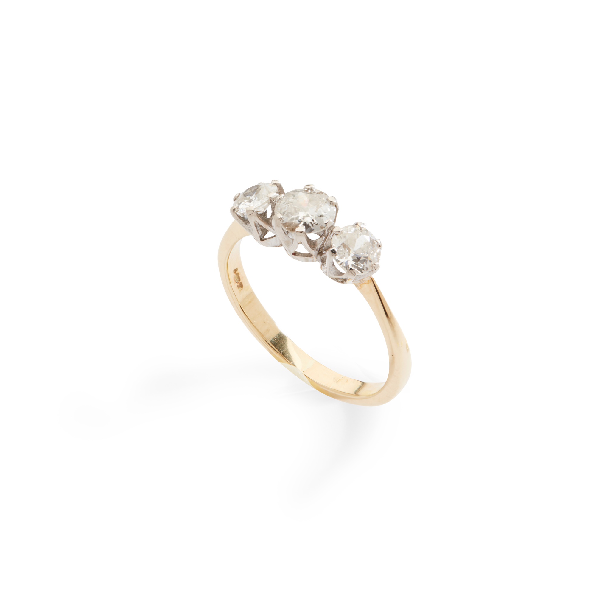 claw-set with three graduated round brilliant-cut diamonds, modelled in 18ct gold