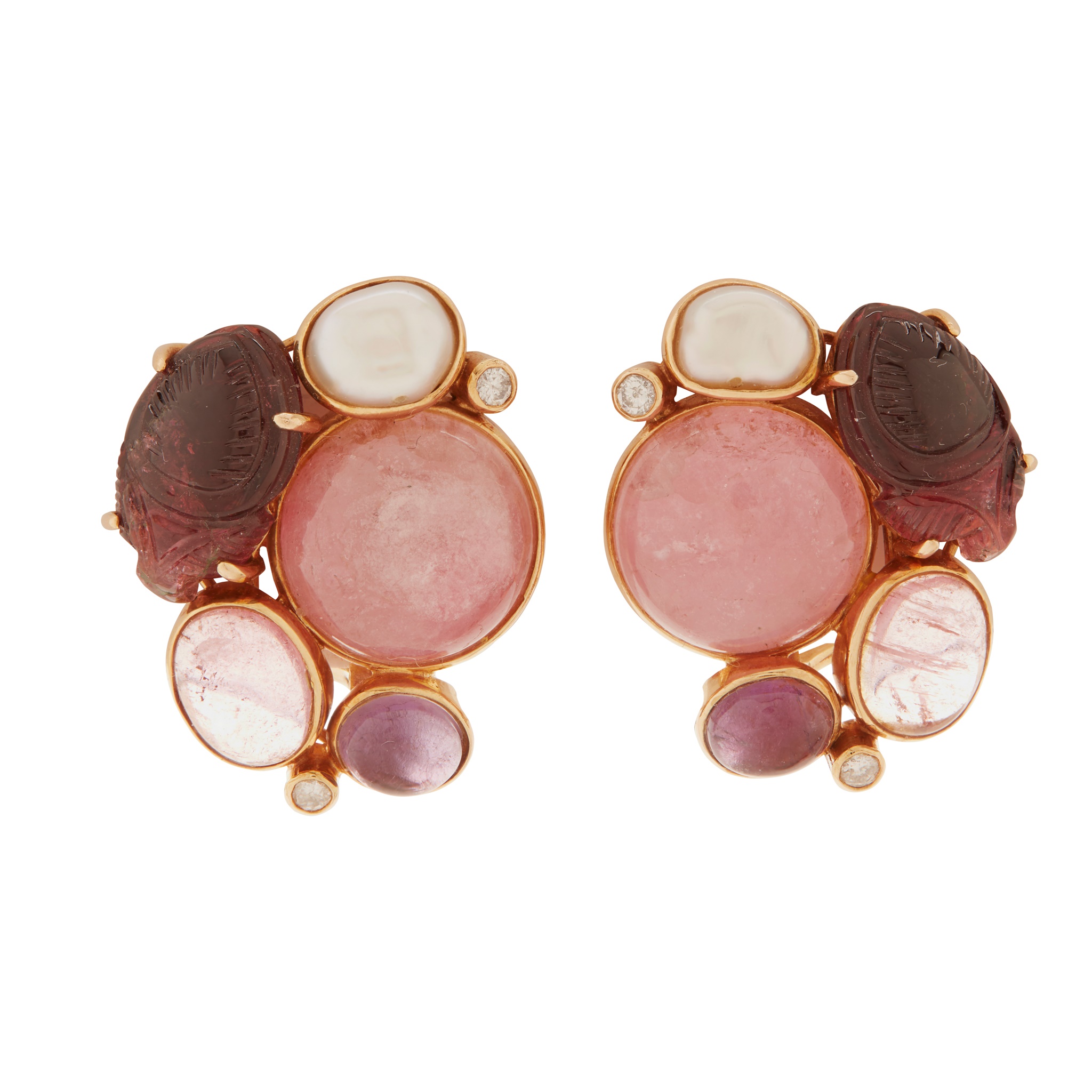 each set with a cluster of cabochon pink quartz and amethyst, blister pearls, small round-cut diamonds and a carved amethyst, clip fittings, stamped 585