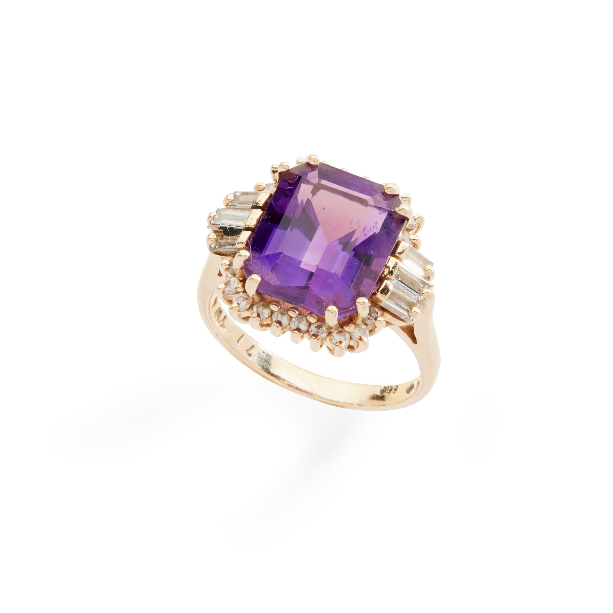 claw-set with a cut-cornered rectangular-cut amethyst in a border of round brilliant and baguette-cut diamonds, stamped 14k