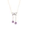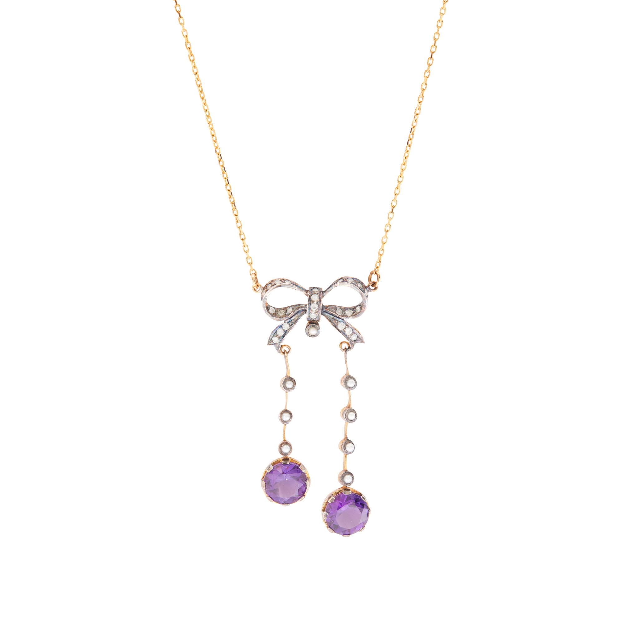 modelled as a bow set with small round brilliant-cut diamonds, suspending two drops set with seed pearls and a round-cut amethyst, unmarked; to a trace link chain