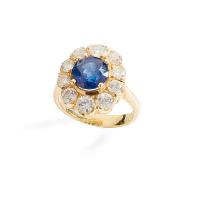 claw-set with a round-cut synthetic sapphire in a border of graduated round brilliant-cut diamonds, stamped 750