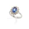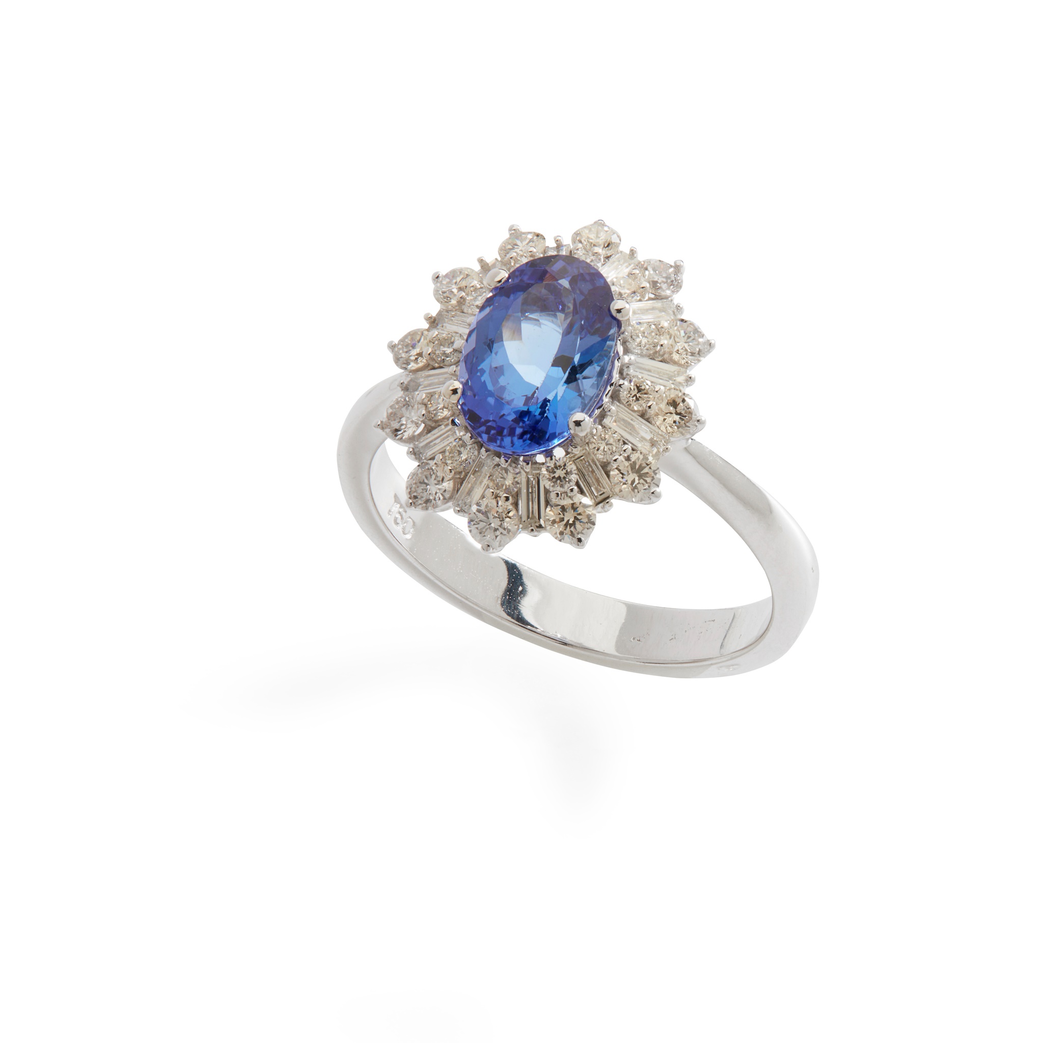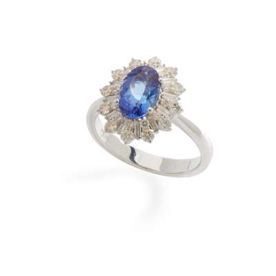 claw-set with an oval-cut Tanzanite in a border of round brilliant-cut diamonds, stamped 750