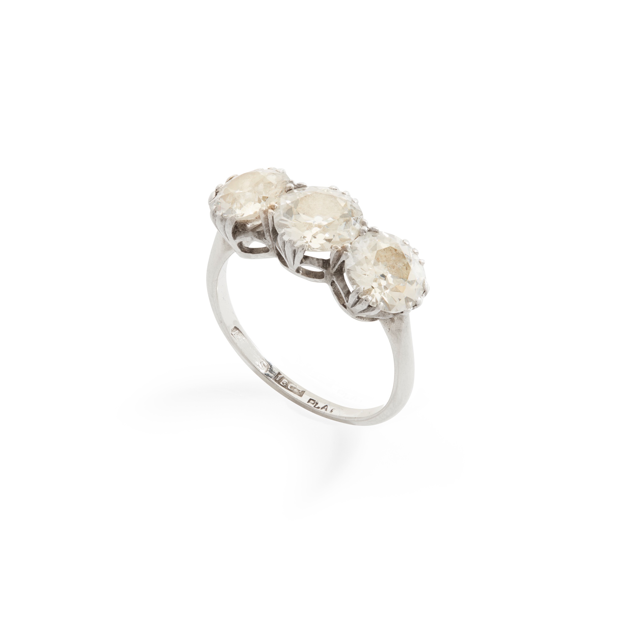 claw-set with three graduated old round-cut diamonds, stamped 18CT PLAT