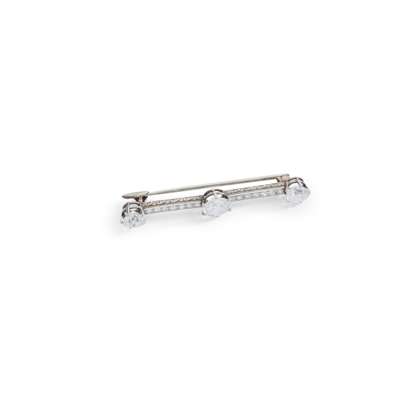 claw-set with three graduated old round-cut diamonds, the bar set with small round-cut diamonds, engraved detail to setting, unmarked