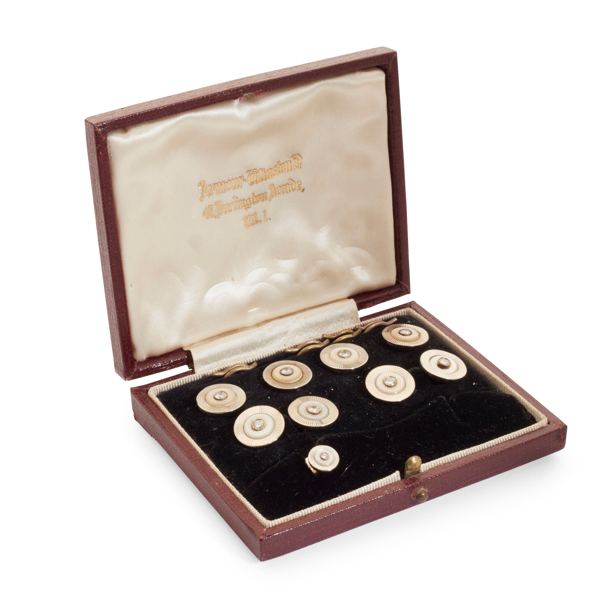 comprising a pair of cufflinks, four buttons and a collar stud (one stud mission), each set with a round brilliant-cut diamond to a mother-of-pearl ground, modelled in 18ct gold; in a fitted case for Armour Winston Ltd ... 47 Burlington Arcade