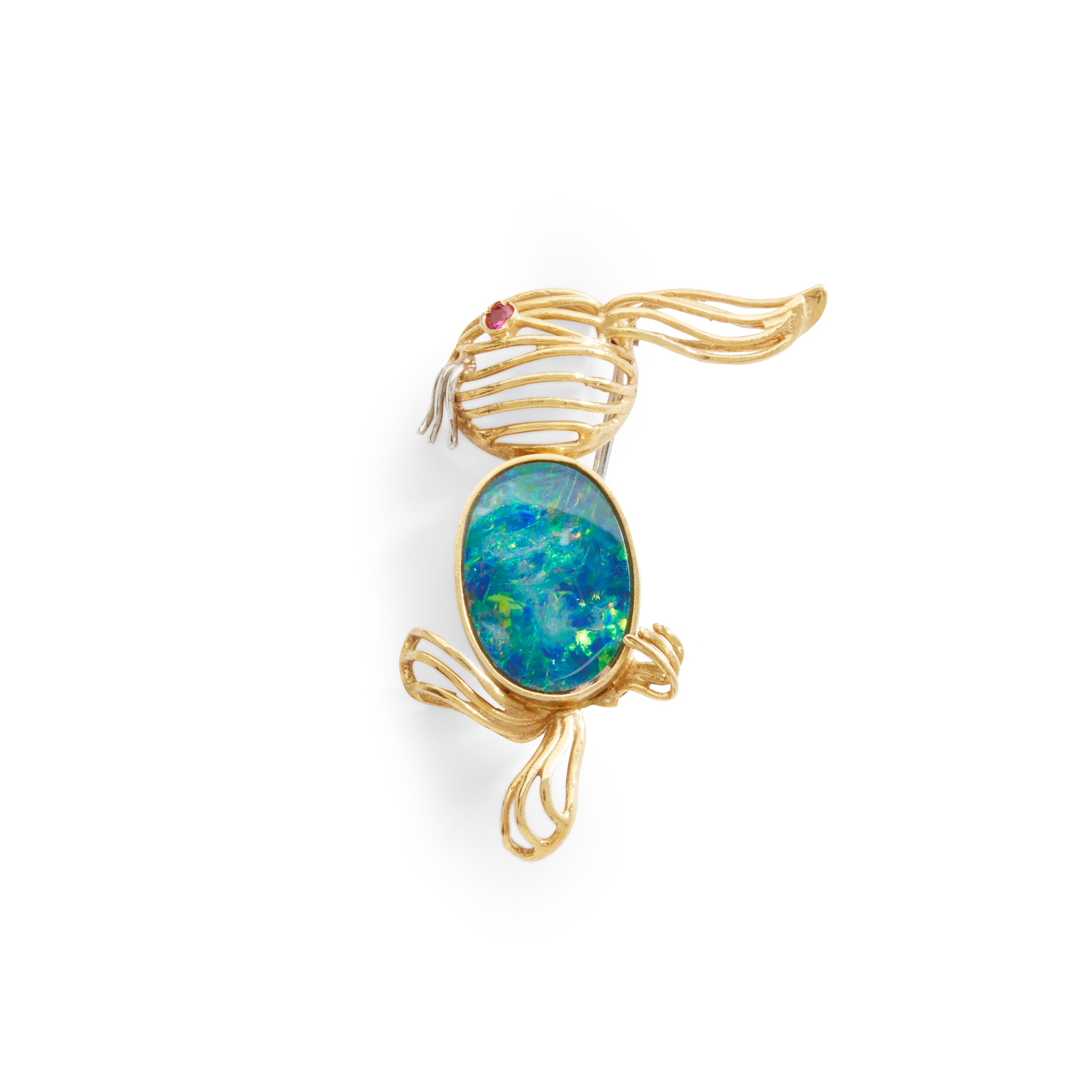 of wirework design with oval opal doublet belly and ruby eye, stamped 18k
