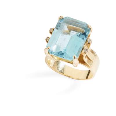 claw-set with a cut-cornered rectangular-cut blue topaz, each shoulder set with two small round brilliant-cut diamonds, stamped 18k