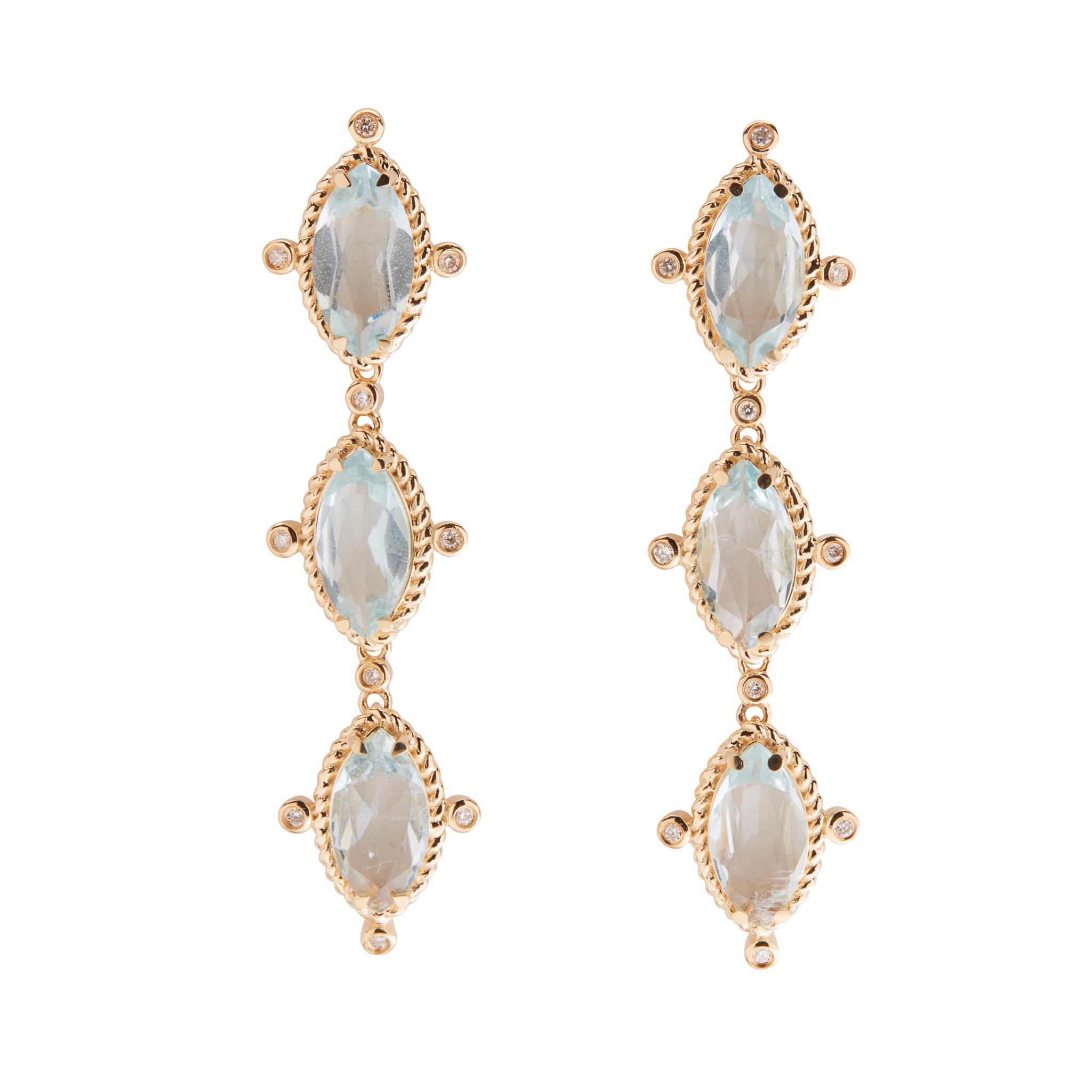 each claw-set with three marquise-cut aquamarines, in a rope-twist border set with round brilliant-cut diamonds, post and butterfly fittings, stamped Au750