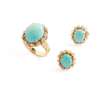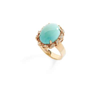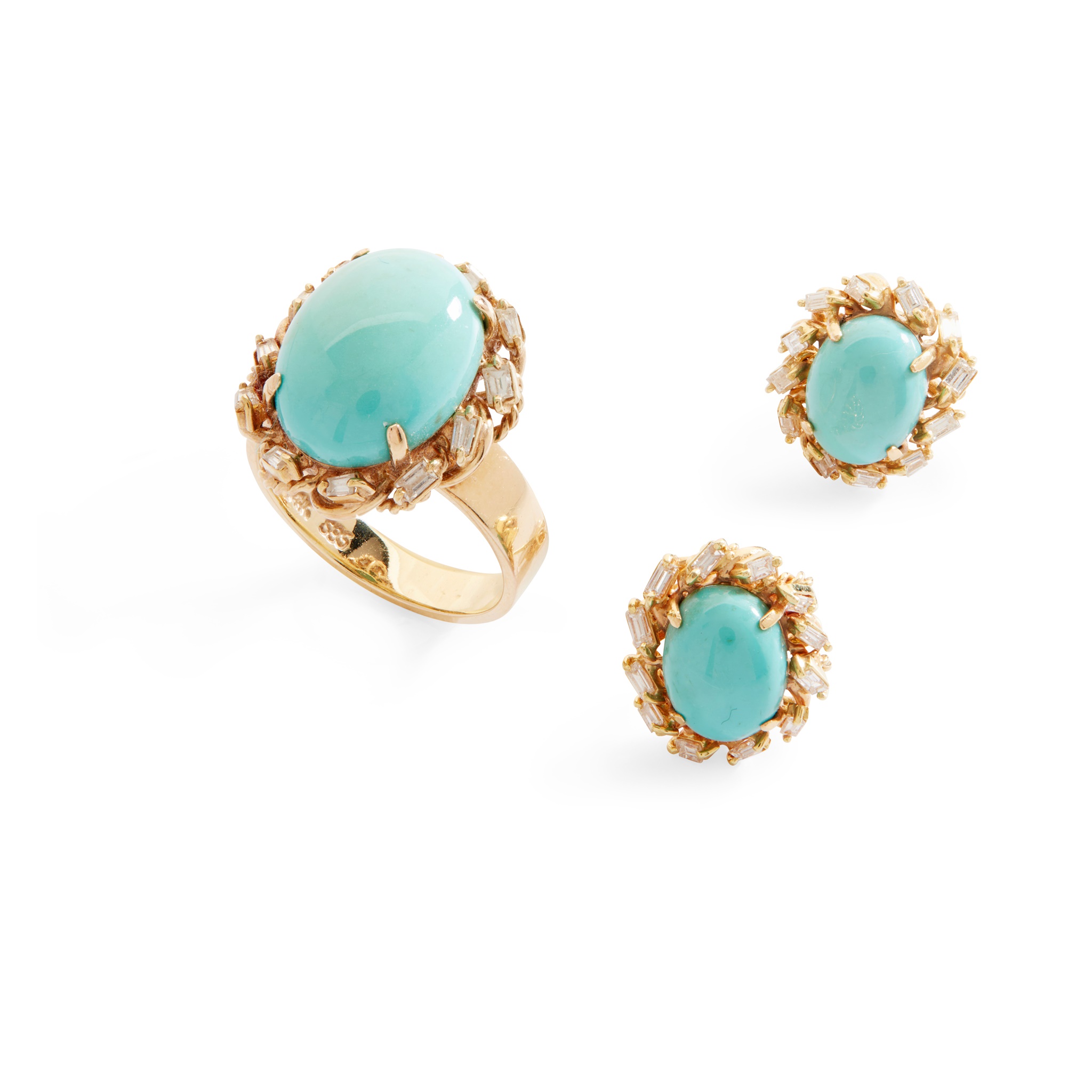 claw-set with an oval cabochon turquoise in a border of baguette-cut diamonds, stamped 14k 585; together with a pair of matching earrings, post and butterfly fittings, unmarked