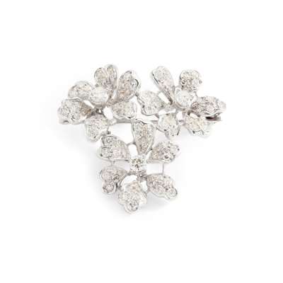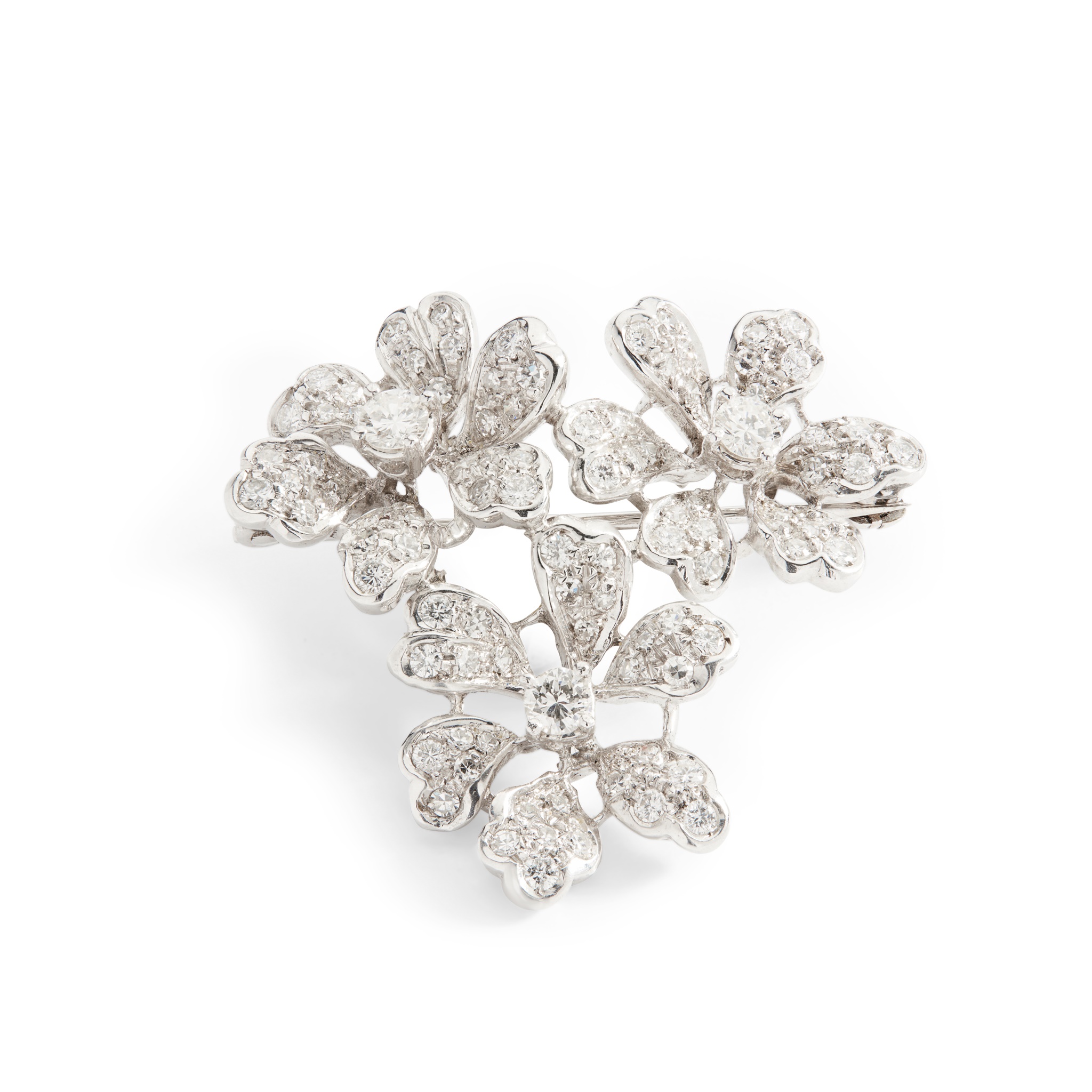 modelled as a cluster of three flowers, set throughout with graduated round brilliant and eight-cut diamonds, stamped 750