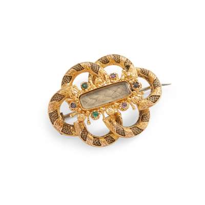 of open scrolling design, the glazed panel with plaited hair in a border of coloured gems and scrolling plaited hair motifs, engraved to reverse W.T. 1861, unmarked