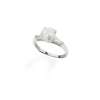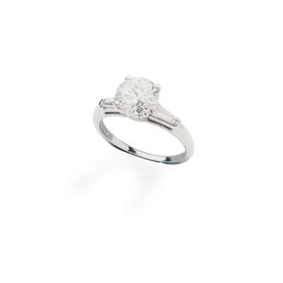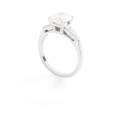 claw-set with a round-cut diamond, each shoulder set with a tapered baguette-cut diamond, to a plain band