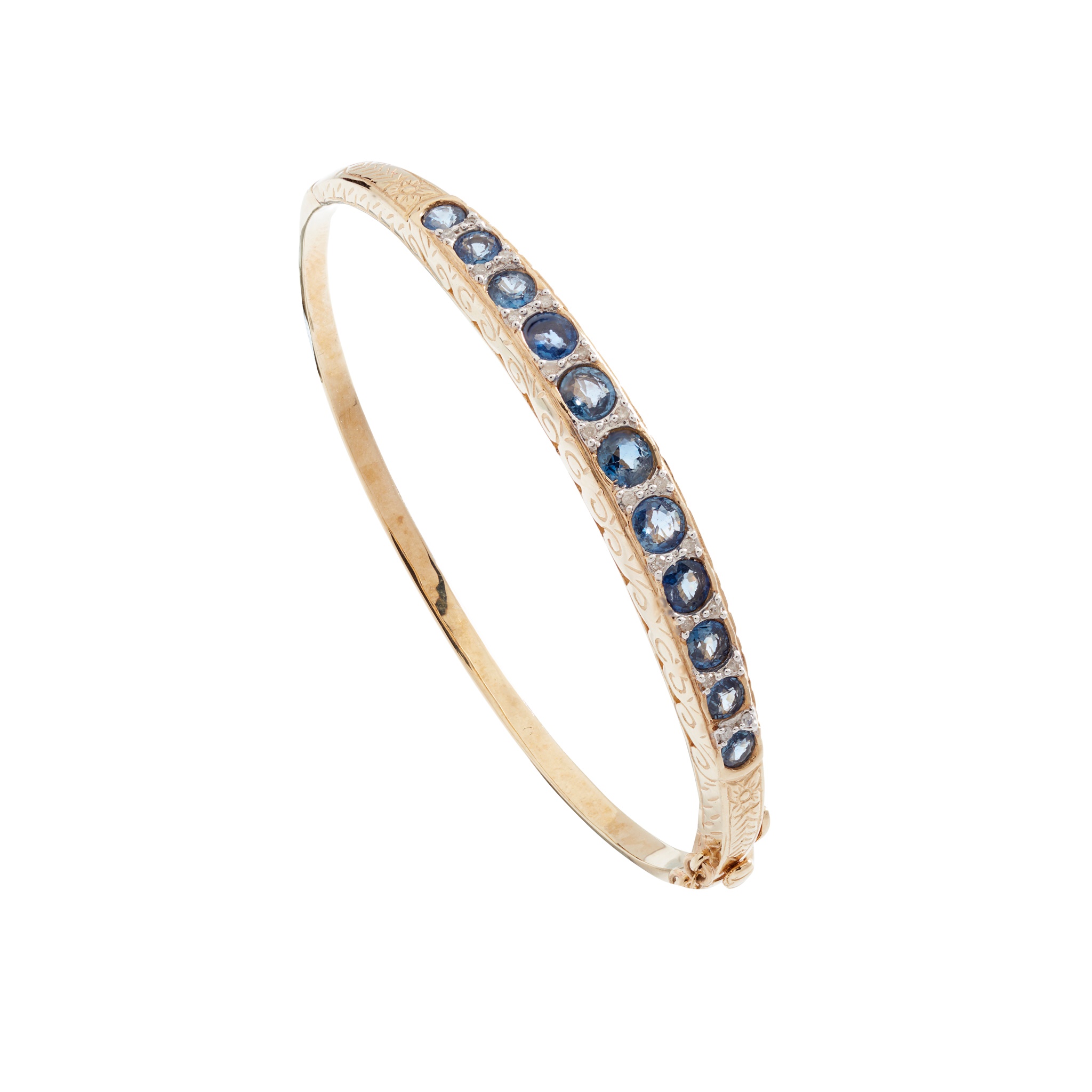 of hinged design, set with graduated cushion-cut sapphires and pairs of small round-cut diamonds, modelled in 9ct gold