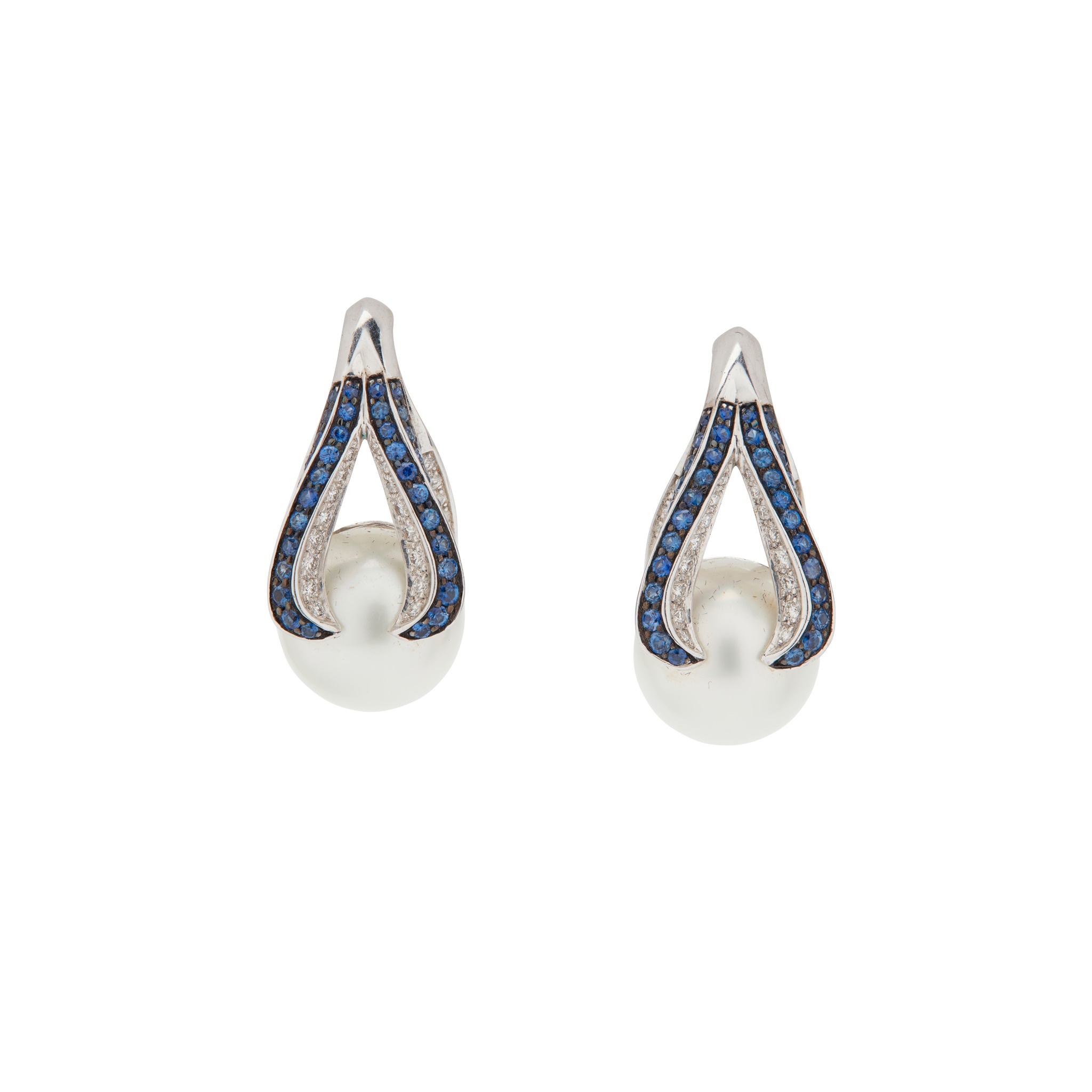 each set with a single South Sea pearl, the stylised mount pavé-set with graduated round-cut sapphires and diamonds, to post and butterfly fittings, modelled in 18ct gold