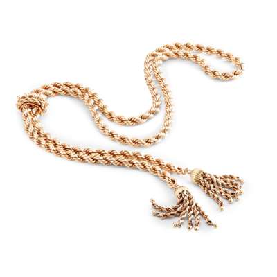 the rope-twist chain with tassel terminals, adjustable clasp, stamped 585 indistinct marks