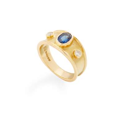 collet-set with an oval-shaped sapphire and two round brilliant-cut diamonds, modelled in 18ct gold