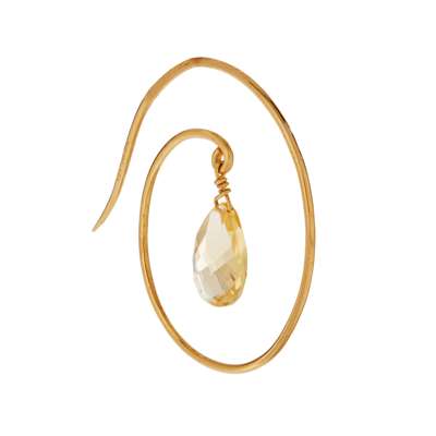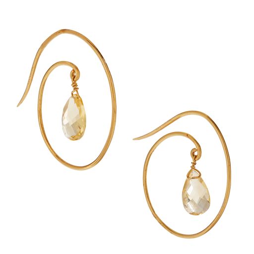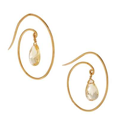 each modelled as a scrolling hoop, suspending a briolette citrine, modelled in 18ct gold