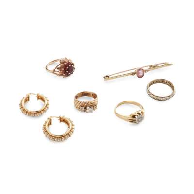 to include a three-stone diamond ring, unmarked; a 9ct gold garnet cluster ring, an 18ct gold single-stone diamond ring; a colourless gem eternity ring; a pink tourmaline and pearl bar brooch and a pair of seed pearl hoop earrings, stamped 750