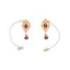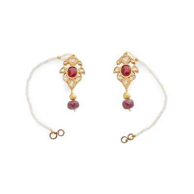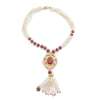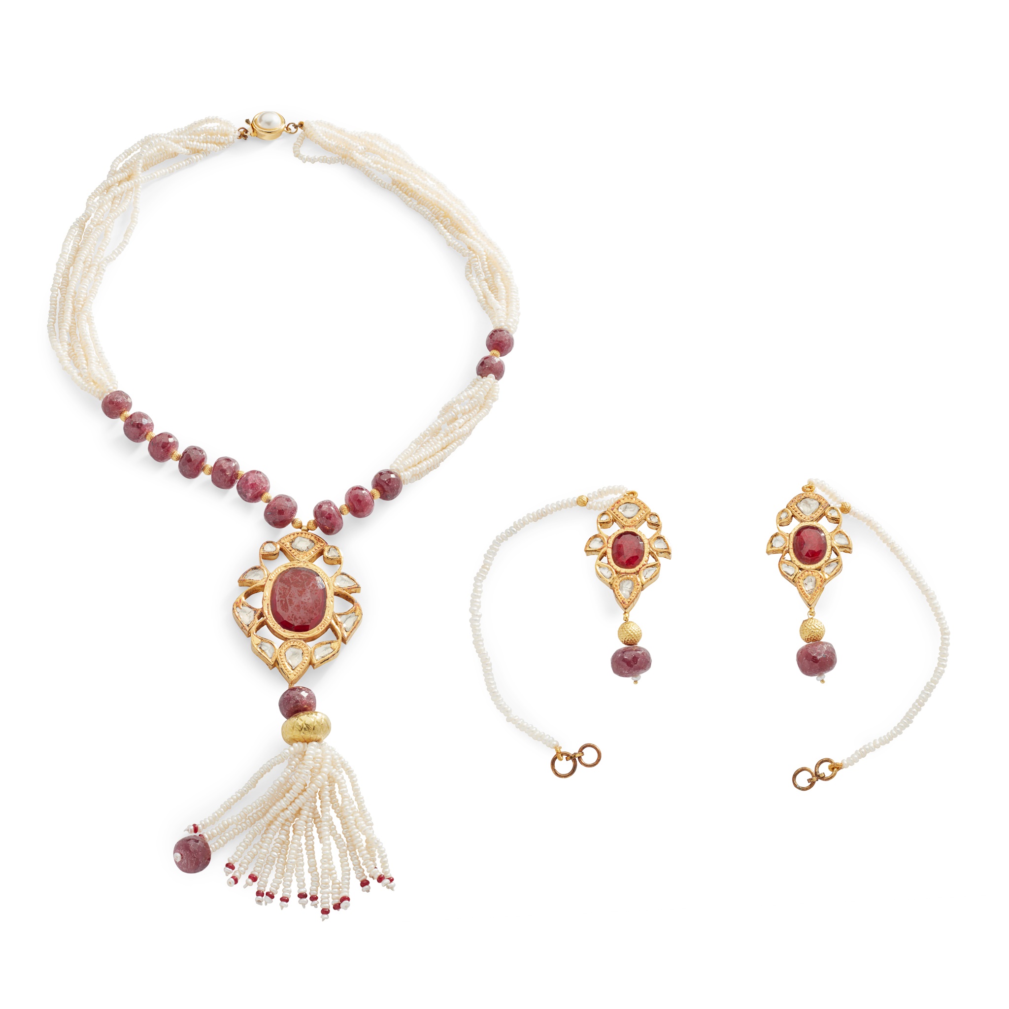 the necklace is composed of seven strands of seed pearls and faceted ruby beads, suspending a pendant set with a large ruby and diamond detail, suspending a seed pearl and ruby tassel pendant; together with a pair of matching earrings