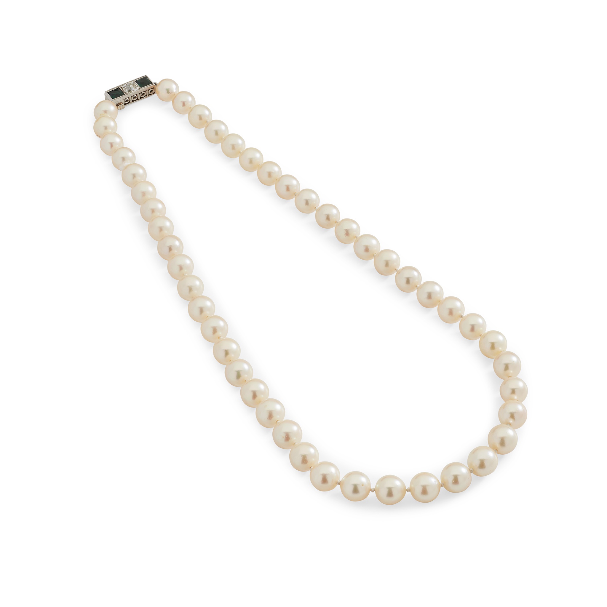 composed of a single strand of cultured pearls, the rectangular clasp with engraved detail, set with a cushion-cut diamond and two French-cut green tourmalines, unmarked