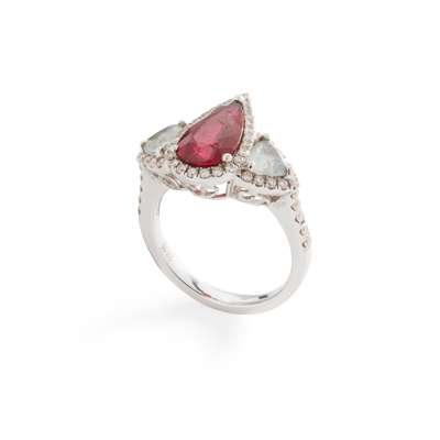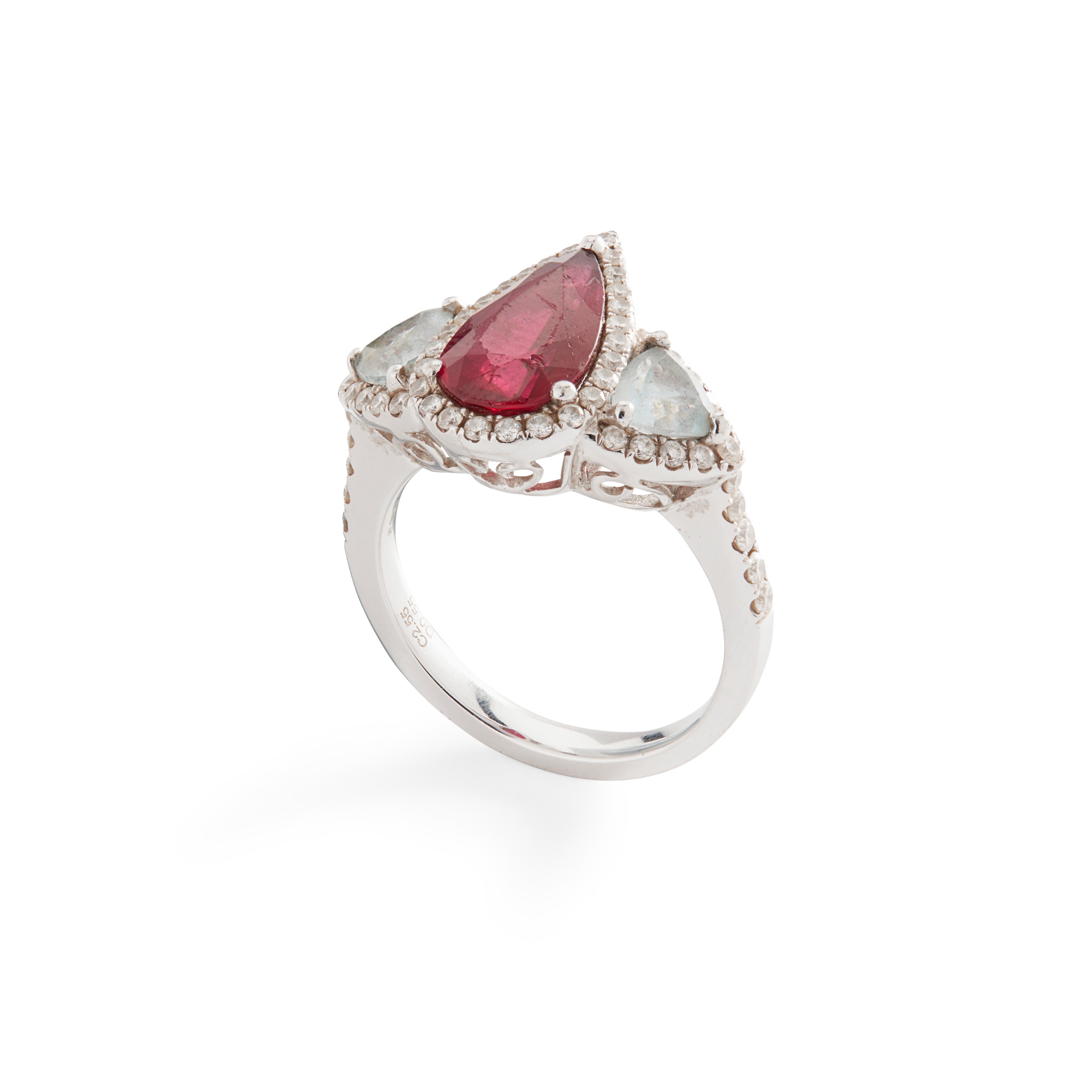 claw-set with a pear-shaped ruby and two triangular-cut aquamarines in a border of round brilliant-cut diamonds, modelled in 18ct gold