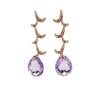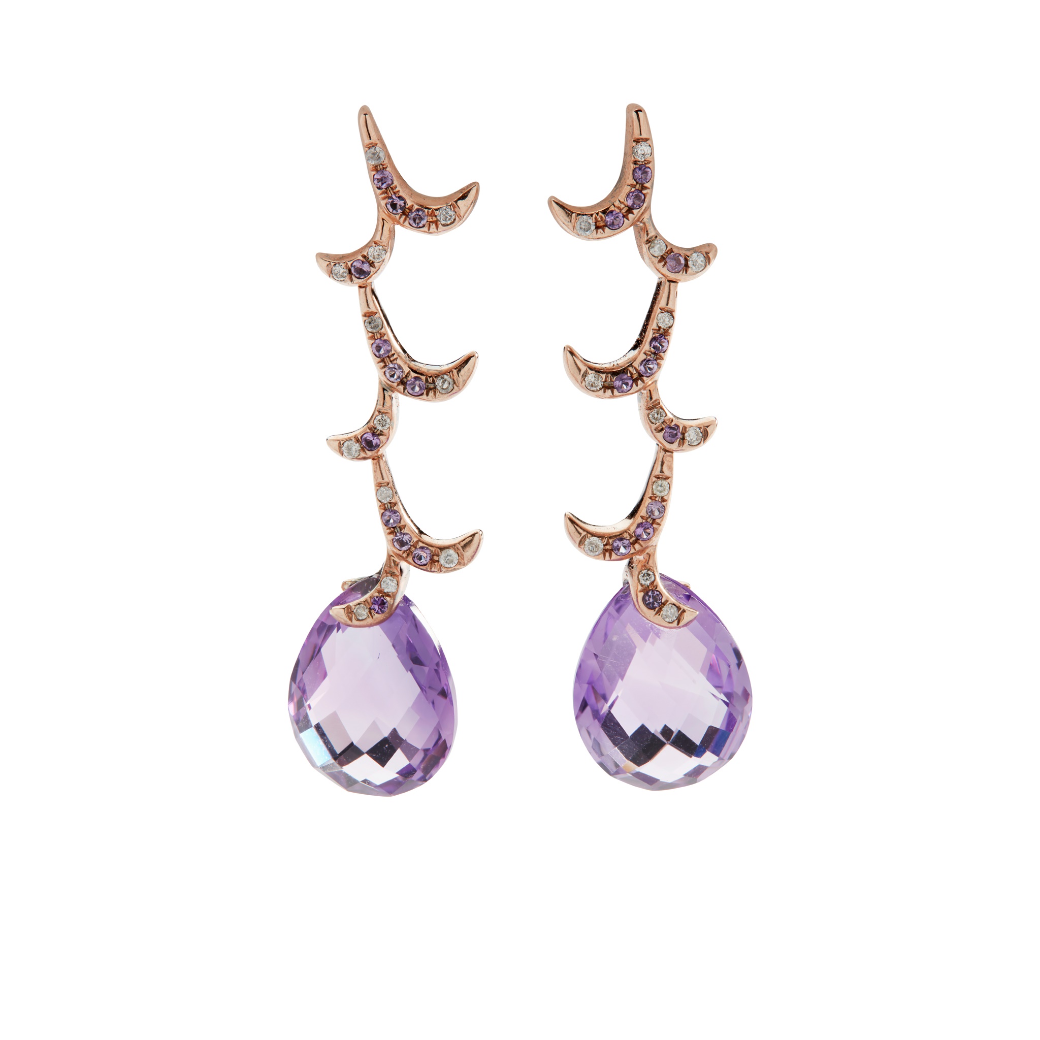 each composed of three curving amethyst and diamond links, suspending a briolette amethyst, post and butterfly fittings, modelled in 18ct gold
