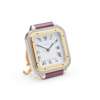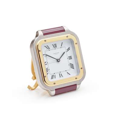 stainless steel case, quartz movement, rounded square white dial with Roman numerals in black, railroad inner seconds track in black, gold-coloured bezel with screw-heads, brown sections above and below, gold-coloured caseback with Cartier Quartz SWISS MADE and 7508 07791 below, in Cartier pouch, no box and papers