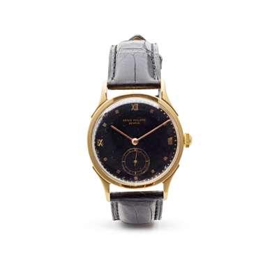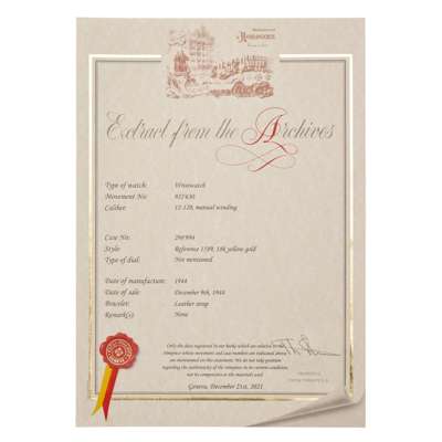 model 1589, round case, manual wind movement, 1944, round black dial with applied gold hour markers, subsidiary seconds at 6, blank caseback, on a later strap, no box, with extract from the archives