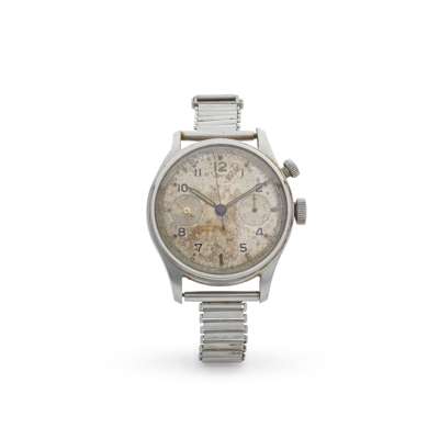 WWII issue, stainless steel case, unsigned manual wind movement, unsigned silver-coloured dial with Arabic numerals and lume plots, sunken subsidiary dials at 3 and 9 for 30 minute register and small seconds, outer seconds track in black with Arabic numerals, black lume-filled hands, centre seconds hand in black, with 'H.S.(broadarrow)9, 3841 to the caseback, crown at 3, single start/stop push-button at 2, on a later bracelet strap, no box and papers
