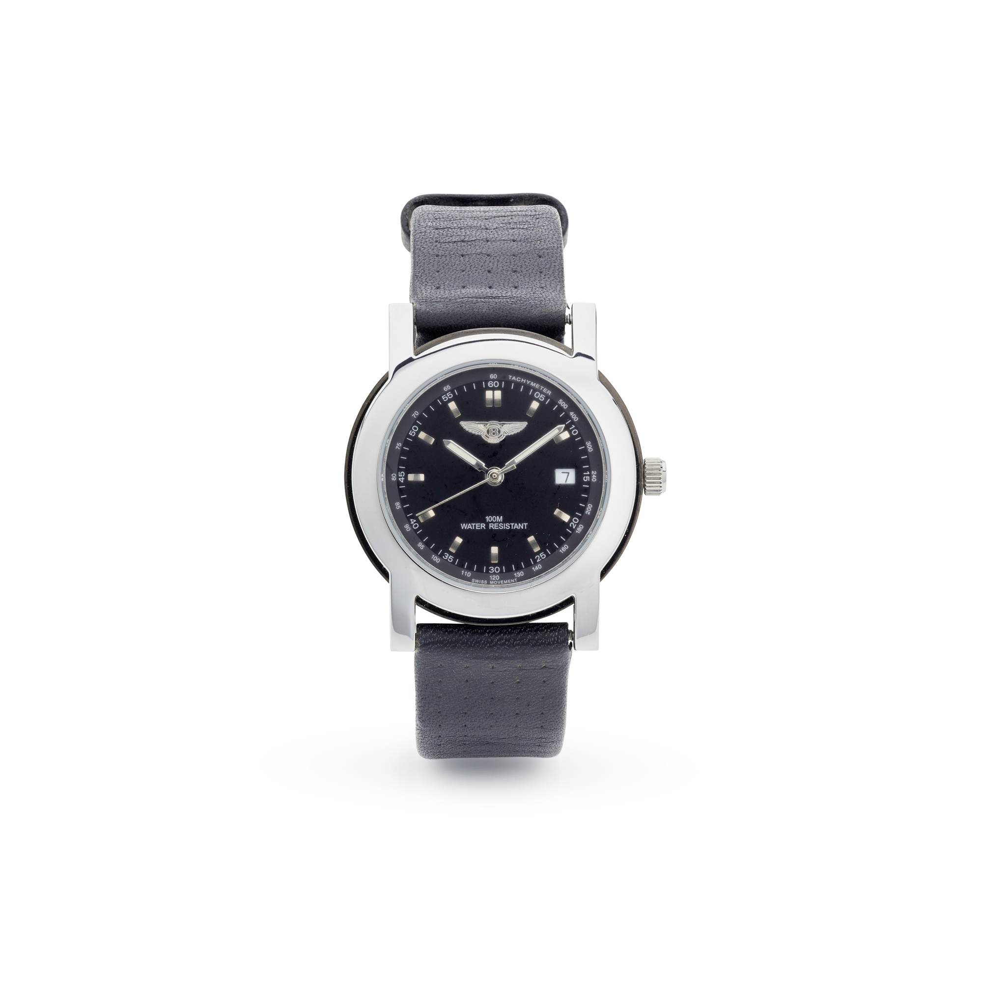 stainless steel case, quartz movement, round black dial with applied stainless steel baton hour markers, date aperture at 3, lume-filled pencil hands, centre seconds hand, outer seconds track in white, tachymeter scale also in white, on a black strap with signed Bentley clasp, in box, with booklets