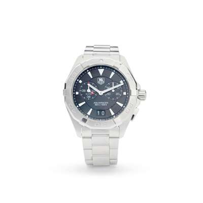Aquaracer Alarm model, stainless steel case, quartz movement, round black dial with applied stainless steel lume-filled hour markers, small seconds at 3, alarm dial at 9, date aperture at 6, outer seconds track in white, on a stainless steel bracelet strap with signed TAG Heuer foldover clasp in box, with outer box, with guarantee card and receipts