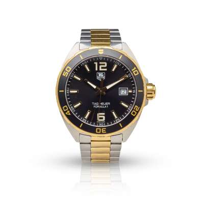Formula 1 model WAZ1121, stainless steel case, quartz movement, round black dial with gold-bordered lume-filled hour markers, date aperture at 3, gold omni-directional bezel with black insert with count-up scale in black, on a stainless steel bi-colour bracelet strap with signed TAG Heuer clasp, in box, with outer box, with booklet and guarantee card