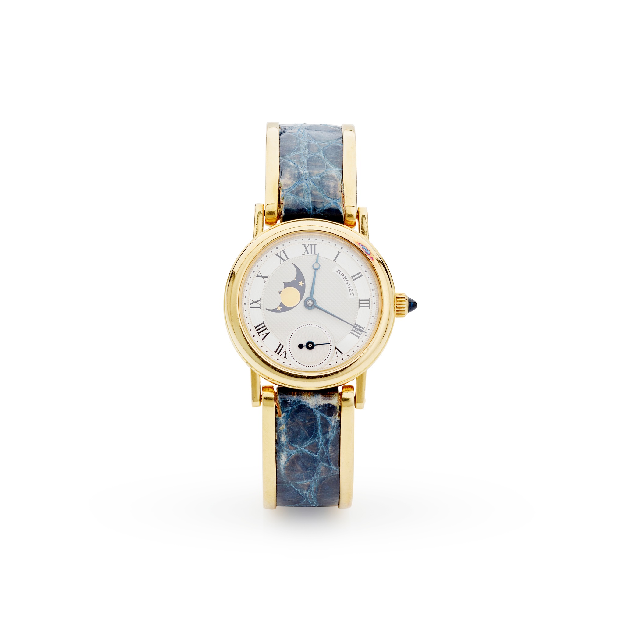 Breguet Classique Moonphase model, manual wind movement, round machined dial with Roman numerals in black, small seconds at 6, cut out moonphase indicator between 9 and 11, blued steel hands, milled case edge, cabochon gem-set crown, with BREGUET 837 to the caseback, on a bangle strap with blue crocodile insert, marked HEMMERLE to one end link and YAGD750 to the other, no box and papers