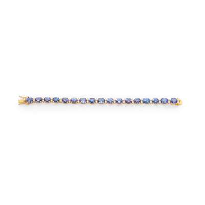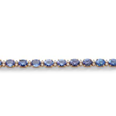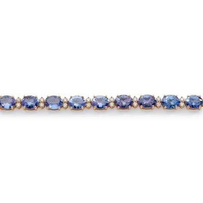 claw-set with seventeen oval-cut Tanzanites and pairs of round brilliant-cut diamonds, stamped K18