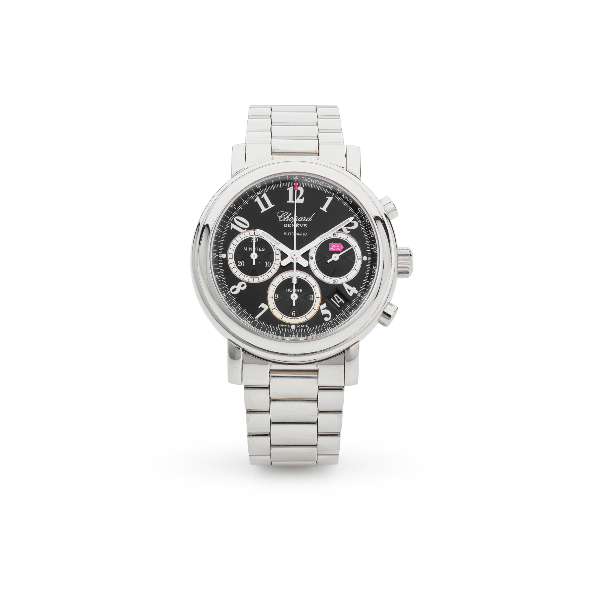 Mille Miglia model 8331, stainless steel case, signed Chopard automatic movement, signed round black dial with Arabic numerals in white, three subsidiary dials at 3, 6 and 9 for small seconds, 2 hour register and 30 minute register respectively, stainless steel pencil hands with lume inserts, centre chronograph hand in white with red terminal, outer seconds track in white, tachymeter scale also in white to the bevelled dial edge, crown with monogram and flanked by twin cylindrical push-buttons, exhibition caseback, a stainless steel bracelet strap with signed concealed Chopard clasp, no box and papers