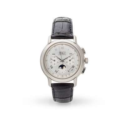 el Primero Chronomaster chronometre model 01.0240.410, stainless steel case, automatic movement, round silver dial with Roman numerals in silver, day and month apertures at 10 and 2, date aperture between 4 and 5, 30 minute register at 3, 12 hour register with moonphase at 6 and small seconds at 9, outer seconds track in black with outer tachymeter scale also in black, on a black strap with clasp with Zenith logo, in box, with outer box, with papers, with chronometer certificate
