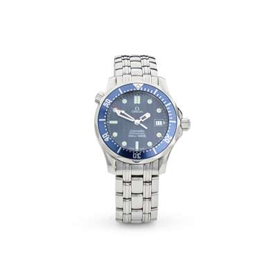 Seamaster Professional model, stainless steel case, quartz movement, round blue dial with lume lot hour markers, date aperture at 3, skeleton hands with lume terminals, centre seconds hand, blue bezel with count-up scale, on a stainless steel bracelet strap with signed Omega deployant clasp, in box, with guarantee card