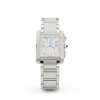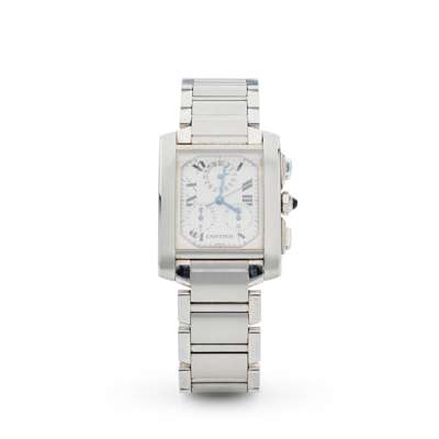 Tank Francaise chronograph model 2303, stainless steel case, quartz movement, white dial with Roman numerals in black, sunken subsidiary dials at 12, 4 and 7 for date, 30 minute register and 12 hour register, outer seconds track in black, blued steel pencil hands, centre seconds hand, on a stainless steel bracelet strap with Cartier signed concealed clasp, no box, with papers dated 2000