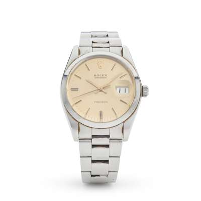 Oysterdate Precision model 6694, stainless steel case, signed Rolex manual wind movement, 1974 from serial number between lugs, signed dial with coronet at 12, applied baton hour markers, date aperture at 3, gold pencil hands with lume inserts, screw-down crown with coronet, on a stainless steel Oyster bracelet strap with 557 to the end link and 78350 19 to the first link, with a signed Rolex clasp with LT10 78350, with an additional possibly original strap numbered 357 to the end link and 7835 19 to the first link, with booklet and swing tag, in box, no papers