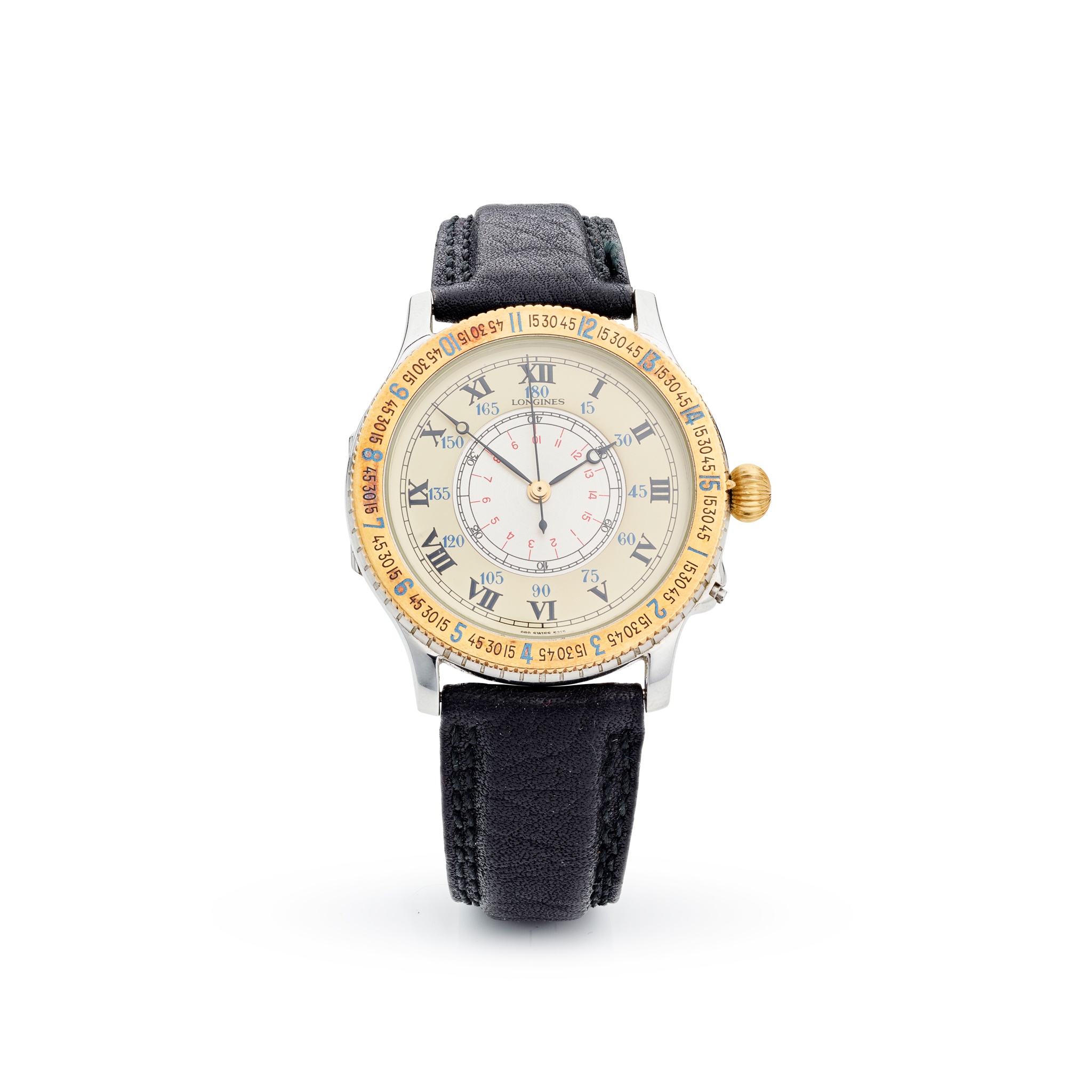 Longines Lindberg Hour Angle reissue model, stainless steel case, automatic movement, round buff dial with Roman numerals in black, central GMT section with Arabic numerals in red and black, railroad outer seconds track, black hands, central seconds hand, gold bezel with numerals in blue and black, the caseback with Longines logo, on a generic strap, in box, with outer box, with booklet and papers