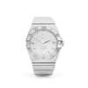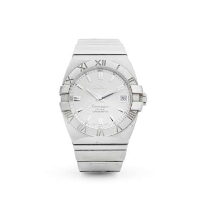 Constellation Co-Axial Chronometer Double Eagle model, stainless steel case, signed Omega automatic movement, round silver-coloured dial with applied stainless steel baton hour markers, date aperture at 3, sword hand with lume inserts, stainless steel bezel with engraved Roman numerals, exhibition caseback with serial number to edge, on an integrated stainless steel bracelet strap with concealed clasp numbered 1655/938, no box and papers