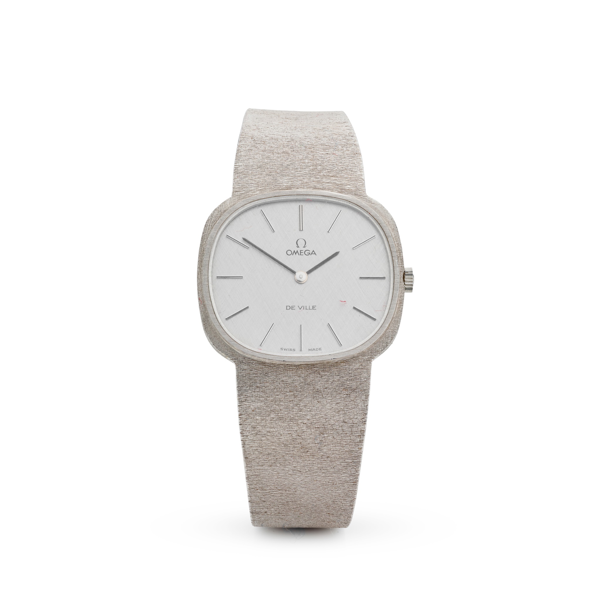 white metal case marked 750 to the interior, signed Omega calibre 625 manual wind movement numbered 35215163, signed rounded square silver-coloured cross hatch dial, applied silver-coloured baton hour markers, pencil hands, textured case edge, on an integrated textured gold bracelet strap, foldover clasp with Omega logo and marked 750, in box, no papers