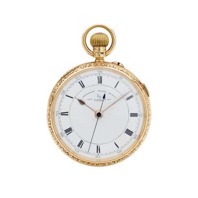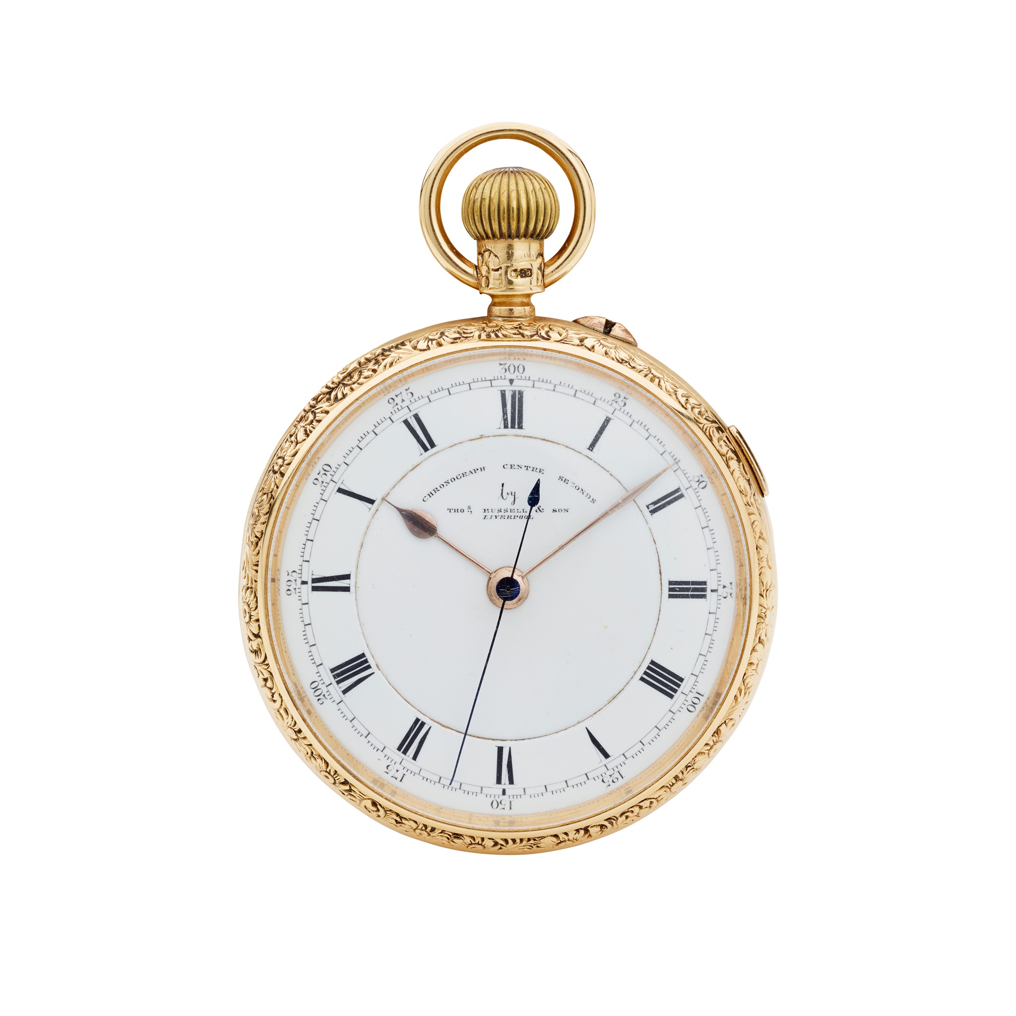 open face, keyless wind, the 3/4 plate movement signed Thos. Russell & Son., round white enamel dial with Roman numerals in black, sunken central section signed Russell and marked CHRONOGRAPH CENTRE SECONDS, with outer half beats scale, the case edges with decorative engraving, with full Chester hallmarks