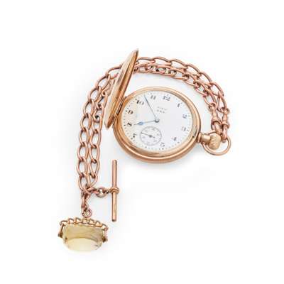 full hunter, keyless wind, marked 375 to the case interior, round white enamel dial with Arabic numerals in black, sunken small seconds at 6, outer seconds track, the case front with shield motif, along with an Albert chain, each link marked 375, with T-bar and two dog clip clasps, with a gem-set fob