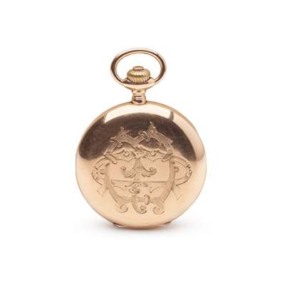 full hunter, keyless wind, case marked 18K, 3/4 bridge plate movement signed Chronometre Alpina and numbered 93562, round white enamel dial with Arabic numerals in black, sunken subsidiary seconds at 6, outer hour track with Arabic numerals in red, ornate pierced gold hands, the casefront with engraved monogram, the inside of the movement cover marked 93562, movement cover exterior inscribed 'ALEX COCHRANE DUNCAN'