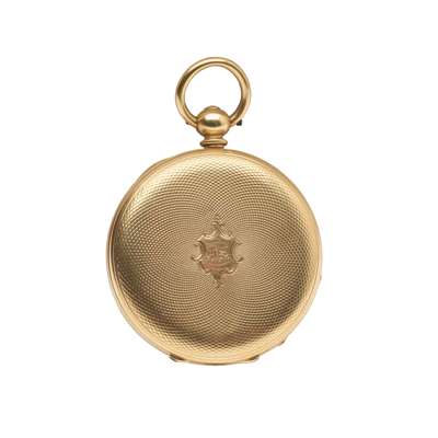 full hunter, key wind, round white enamel dial with Roman numerals in black, movement signed STAUFFER, CX DE FONDS, sunken small seconds at 6, railroad outer seconds track in black, blued steel leaf hands, the case interior marked 18, machined engraving to the casefront and back