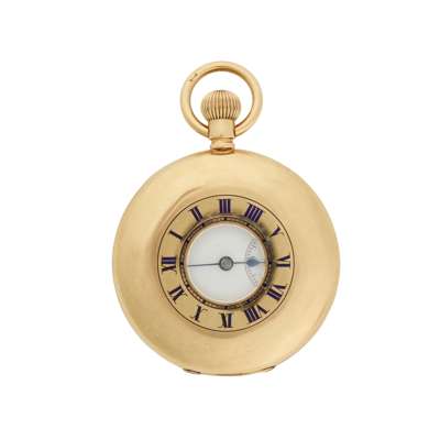 half hunter, keyless wind, 18ct gold case, unsigned 3/4 plate movement, round white enamel dial with Roman numerals in black, sunken small seconds at 6, railroad outer seconds track in black, blued steel leaf hands, case front with Roman numerals in enamel around the viewing aperture, the caseback with engraved initials and crest