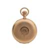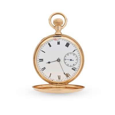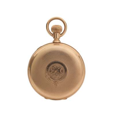 full hunter, keyless wind, marked 14K to the case interior, signed Waltham movement, round white enamel dial with Roman numerals in black, sunken small seconds at six, railroad outer seconds track in black, with personalised inscription to the movement cover, numbered 6279420, monogram within belt motif to case exterior